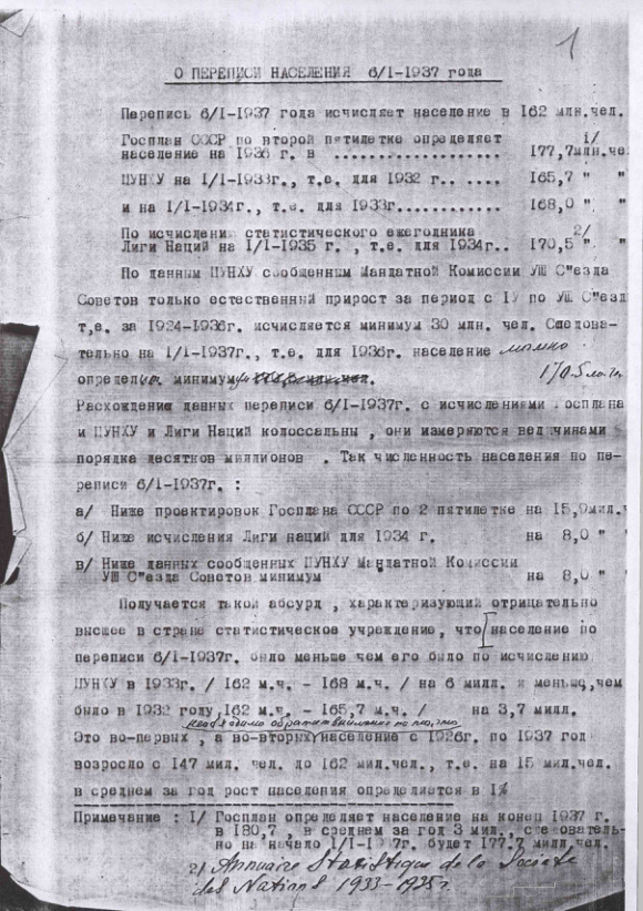 Черновик записки П.И. Попова "О переписи населения 6 / I-1937 г."