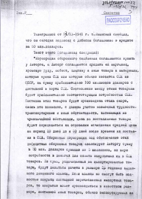 Сообщение о подписании Соглашения о кредите в США. 17 сентября 1941 г.