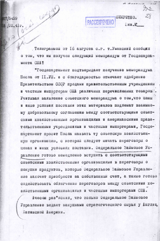 Сообщение о получении Меморандума Госдепартамента о разрешении импорта в США ряда товаров из СССР. 18 августа 1941 г.