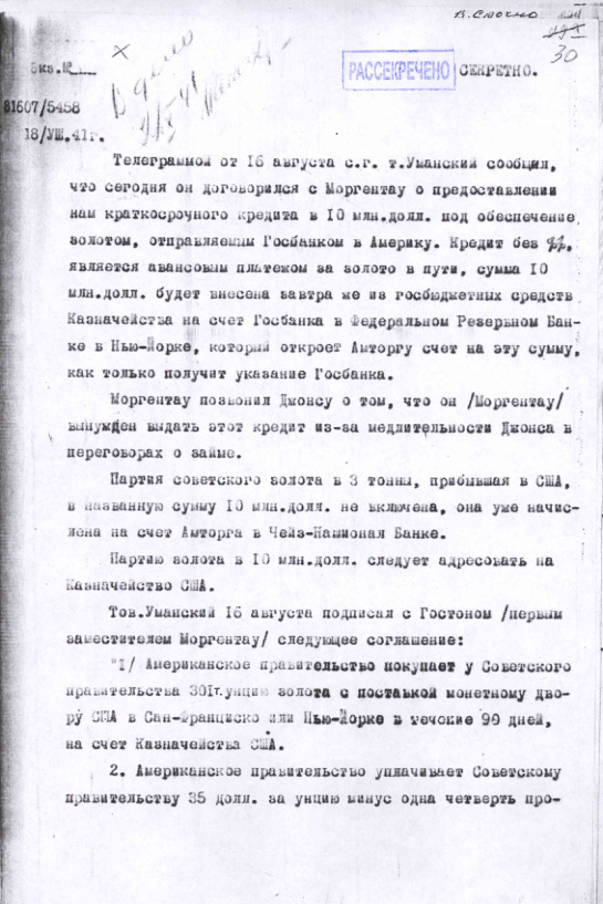 Сообщение о предоставлении СССР в США краткосрочного кредита под обеспечение золотом. 18 августа 1941 г.