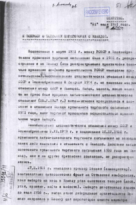 Докладная записка о торговых взаимоотношениях с Канадой. 31 июля 1941 г.