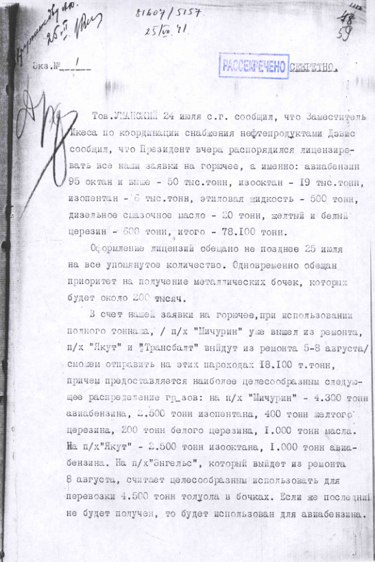 Сообщение о получении лицензии на поставку нефтепродуктов в СССР. 25 июля 1941 г.