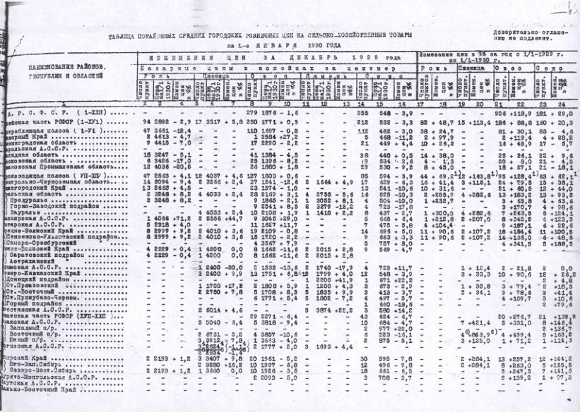 Таблицы порайонных средних городских розничных цен на сельскохозяйственные товары с 1 января по 1 июня 1930 г.
