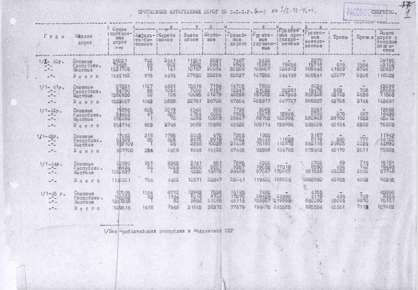 Протяженность автогужевых дорог в СССР на 1 января 1940-1945 гг.
