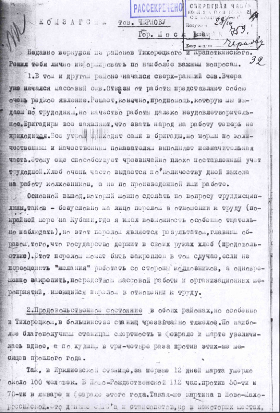 Отчет Ароцкера о положении Тихорецкого и Кропоткинского районов Северного Кавказа. 22 марта 1933 г.