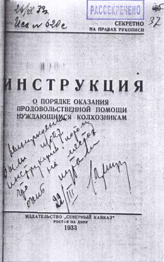 Инструкция о порядке оказании продовольственной помощи нуждающимся колхозникам. 22 марта 1933 г.