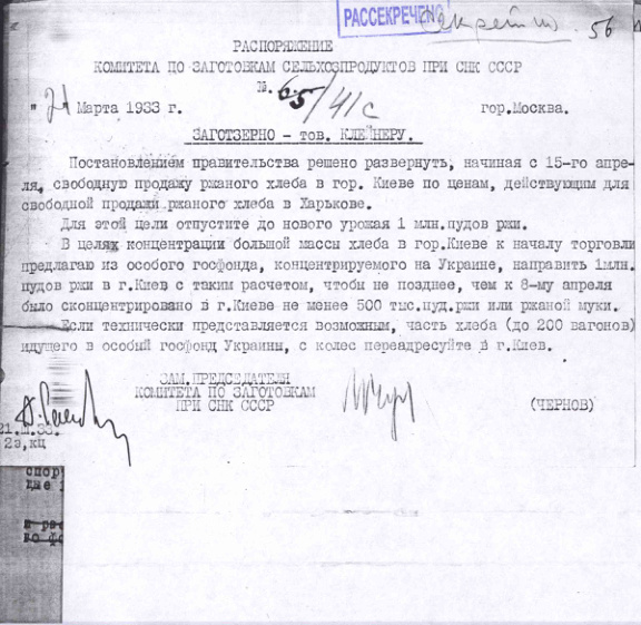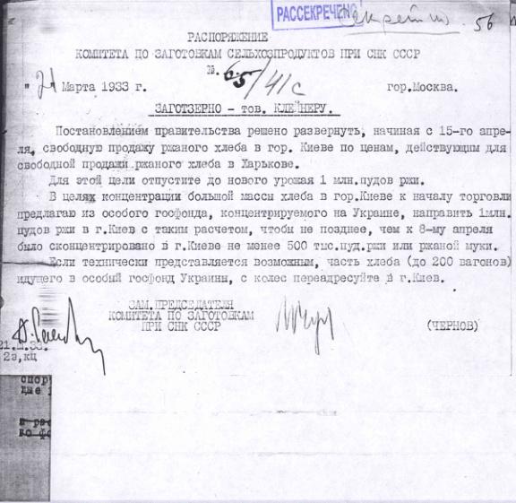 Распоряжение № 65/41с Комитета по заготовкам сельхозпродуктов при СНК о развертывании свободной продажи хлеба в г.Киеве. 21 марта 1933 г.