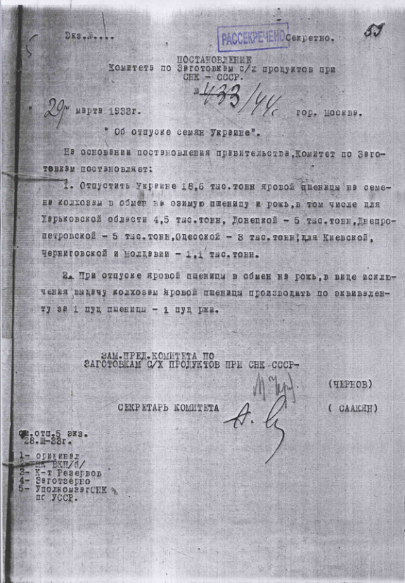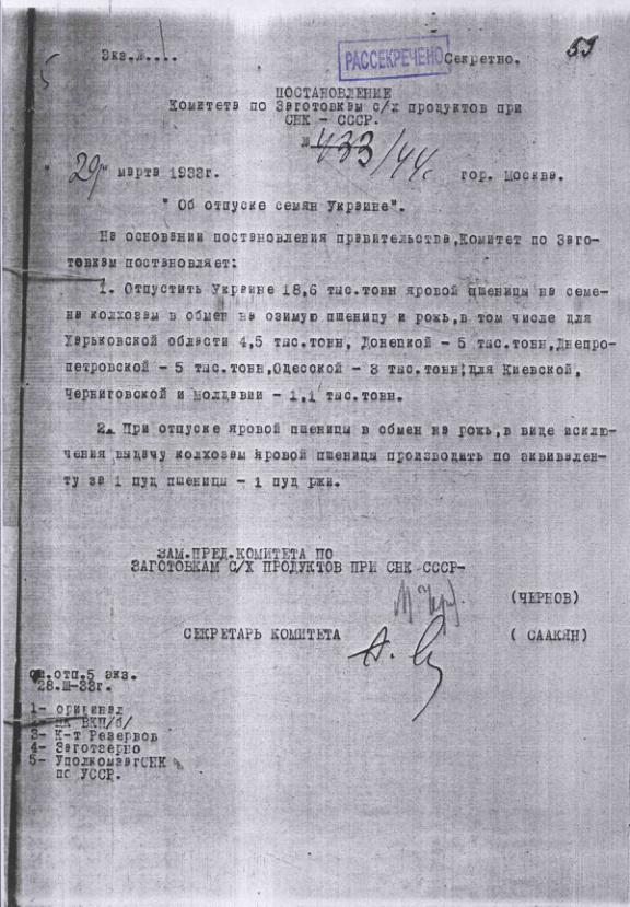 Постановление № 433/44с Комитета по заготовкам сельхозпродуктов при СНК об отпуске семян Украине. 29 марта 1933 г.