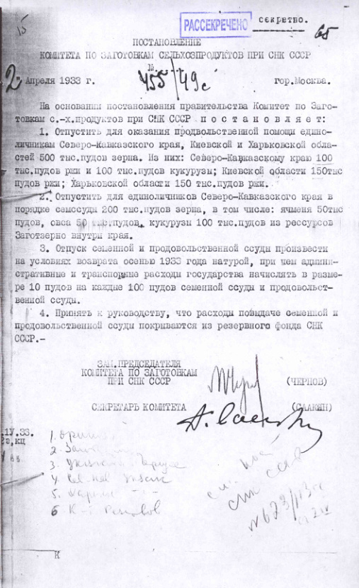 - Постановление № 455/49с Комитета по заготовкам сельхозпродуктов при СНК об оказании продовольственной помощи единоличникам Северо-Кавказского Края и УССР. 2 апреля 1933 г.