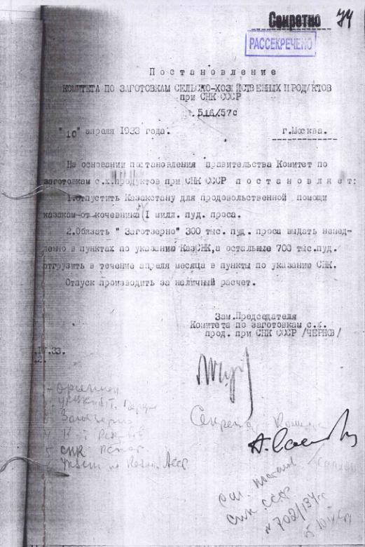 Постановление № 516/57с Комитета по заготовкам сельхозпродуктов при СНК об оказании продовольственной помощи Казахстану. 10 апреля 1933 г.