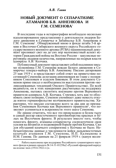 Новый документ о сепаратизме атаманов Б.В. Анненкова и Г.М. Семенова