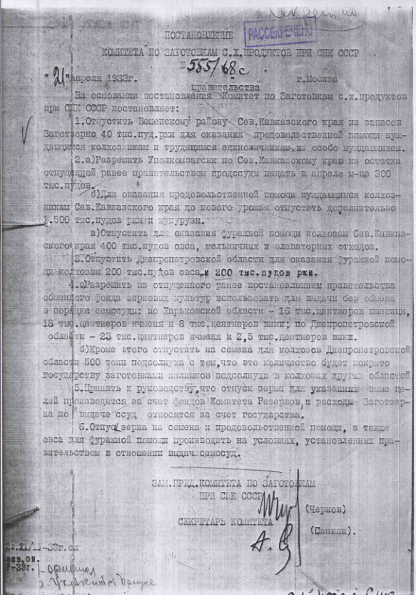 - Постановление № 555/68с Комитета по заготовкам сельхозпродуктов при СНК об оказании продовольственной помощи Северному Кавказу и УССР. 21 апреля 1933 г
