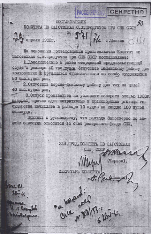 Постановление № 571/71с Комитета по заготовкам сельхозпродуктов при СНК о выделении продовольственной ссуды Северному Кавказу.23 апреля 1933 г.