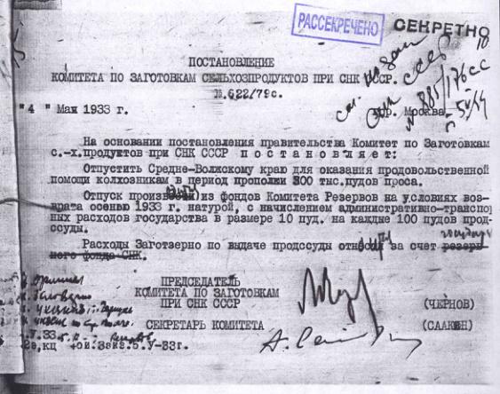 Постановление № 622/79с Комитета по заготовкам сельхозпродуктов при СНК об оказании продовольственной помощи Средне-Волжскому краю. 4 мая 1933 г.