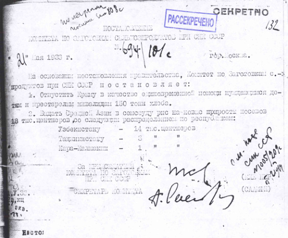 - Постановление № 694/101с Комитета по заготовкам при СНК об оказании продовольственной помощи Крыму и выделению семенной ссуды для Средней Азии. 21 мая 1933 г.
