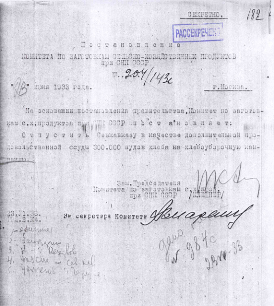 Постановление № 904/143с Комитета по заготовкам при СНК о выделении продовольственной ссуды Северному Кавказу. 23 июня 1933 г.
