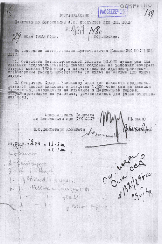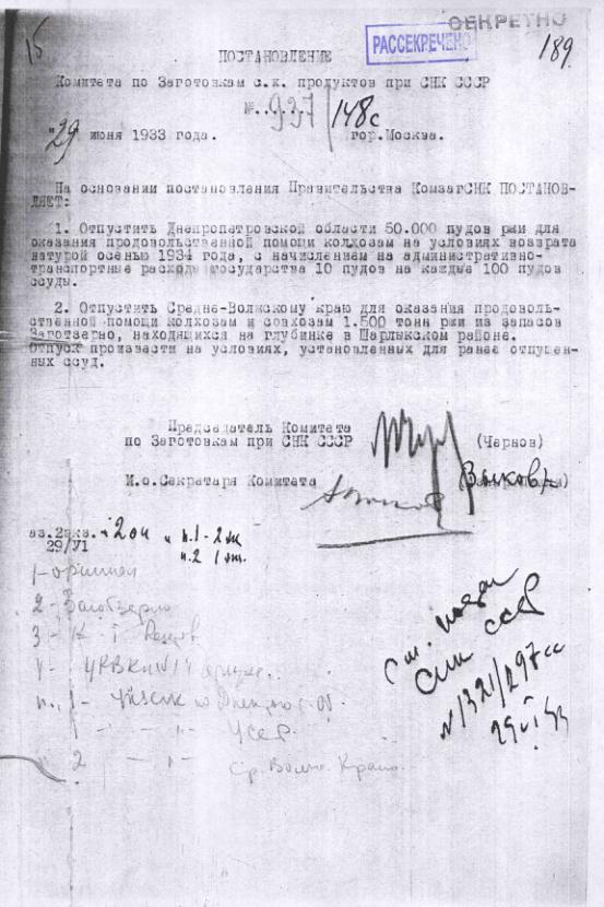 Постановление № 937/148с Комитета по заготовкам при СНК об оказании продовольственной помощи УССР и Средне-Волжскому краю. 29 июня 1933 г.