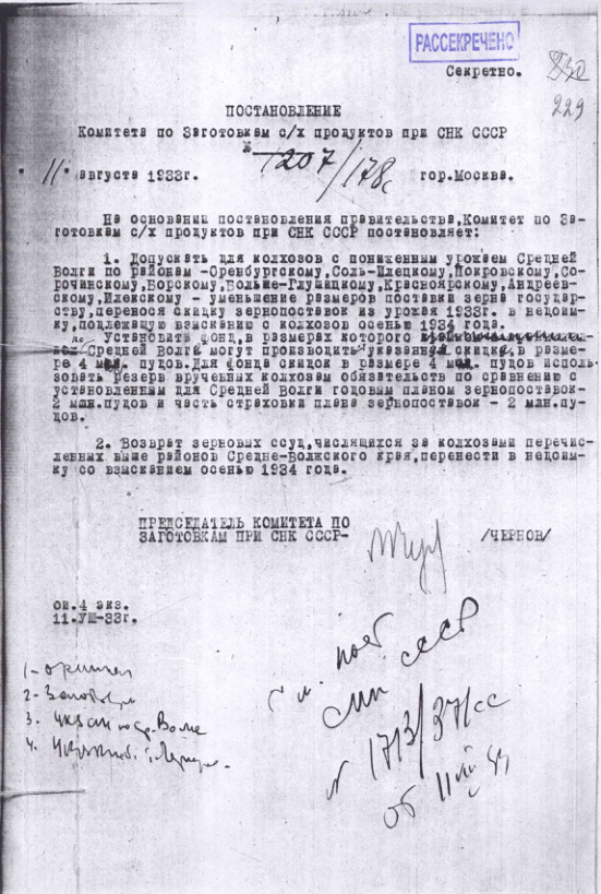 - Постановление № 1207/178с Комитета по заготовкам сельхозпродуктов при СНК о снижении размера заготовок с колхозов с пониженным урожаем. 11 августа 1933 г.