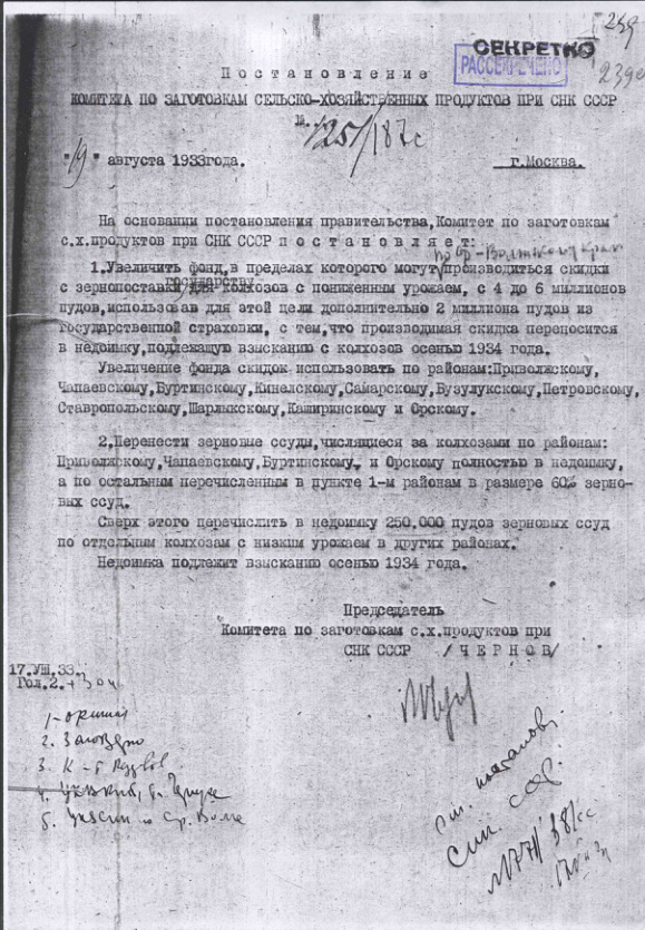 Постановление № 1251/187с Комитета по заготовкам о снижении размера заготовок с колхозов с пониженным урожаем. 19 августа 1933 г.