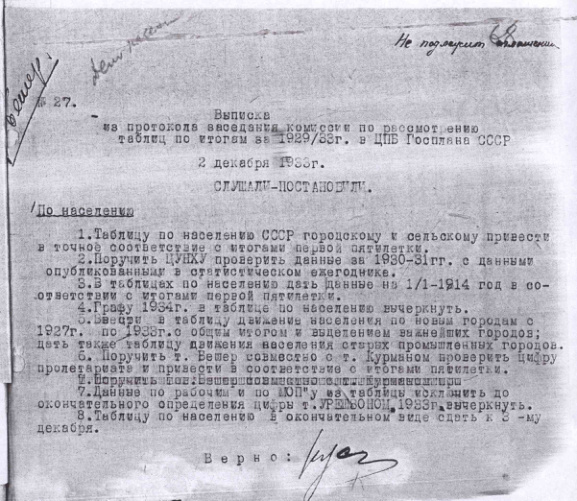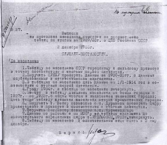 Выписка из протокола заседания комиссии по рассмотрению таблиц по итогам за 1929/33 г. в ЦПБ Госплана СССР. 2 декабря 1933 г.