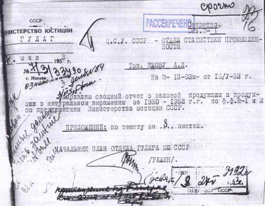 Сводный отчет о производстве валовой продукции по предприятиям Министерства юстиции СССР за 1950-1952 гг. 7 мая 1953 г.
