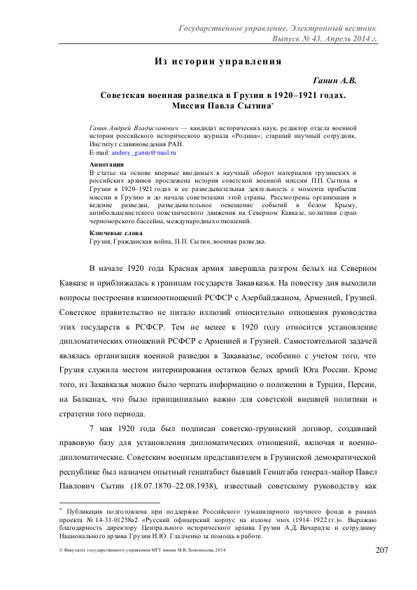 Советская военная разведка в Грузии в 1920-1921 годах. Миссия Павла Сытина