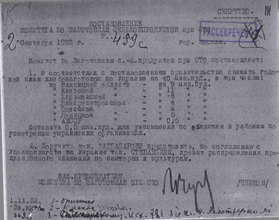 Постановление № 459с Комитета по заготовкам сельхозпродуктов при СТО о снижении годового плана хлебозаготовок по Украине. 2 сентября 1932 г.