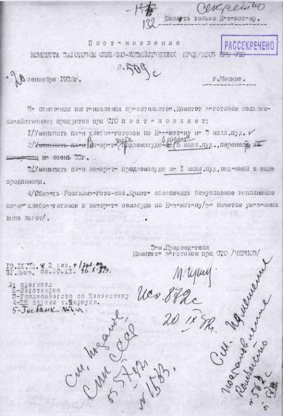 Постановление № 509с Комитета по заготовкам сельхозпродуктов при СТО о снижении плана хлебозаготовок по Казахстану. 20 сентября 1932 г.