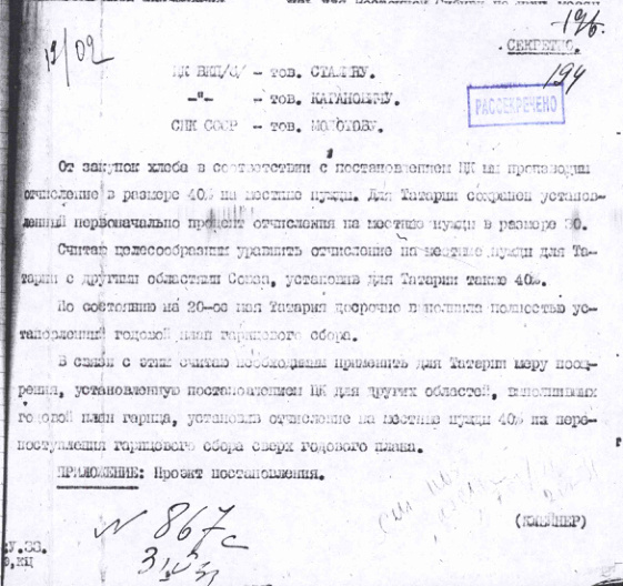 Предложение члена комитета по заготовкам сельхозпродуктов СНК СССР И.М. Клейнера об отчислении урожая на местные нужды Татарской АССР. 31 мая 1933 г.