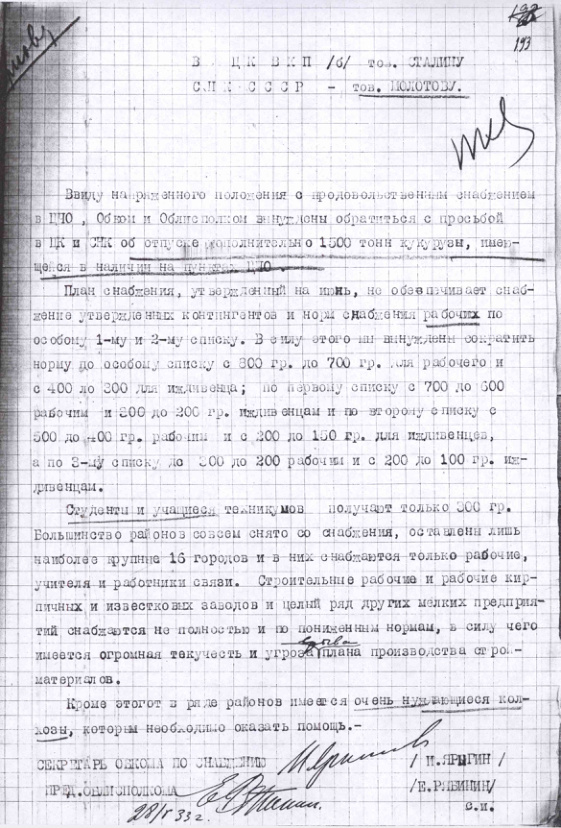Просьба председателя обкома по снабжению И. Ярыгина и пред. облисполкома Е.Рябинина о выделении продовольственной помощи ЦЧО. 28 мая 1933 г.