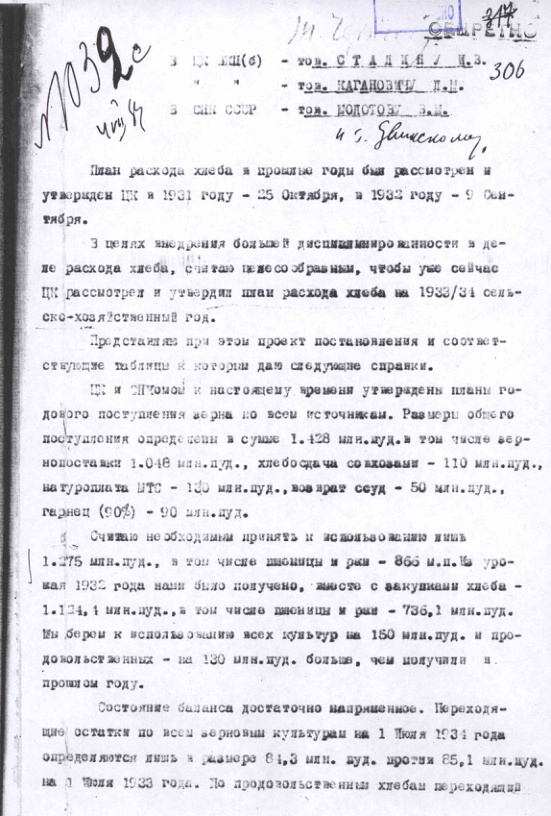 Проект плана распределения хлеба на 1933-1934 сельскохозяйственный год. 4 июля 1933 г.