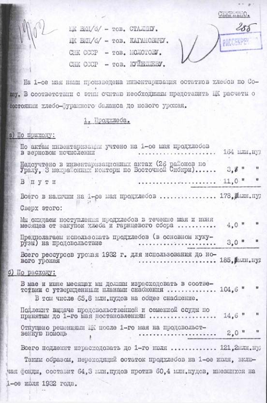 Справка о наличии хлеба на 1 мая 1933 года и расчет хлебофуражного баланса до следующего урожая.