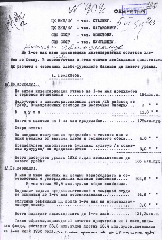 Справка о наличии хлеба на 1 мая 1933 года и расчет хлебофуражного баланса до следующего урожая с приложениями. 3 июня 1933 г.