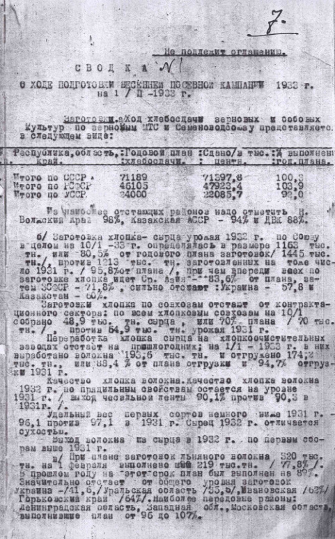 Сводка № 1 о ходе подготовки весенней посевной компании 1933 г. на 1/II-1933 г.
