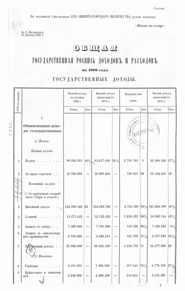 Общая государственная роспись доходов и расходов на 1870 г.