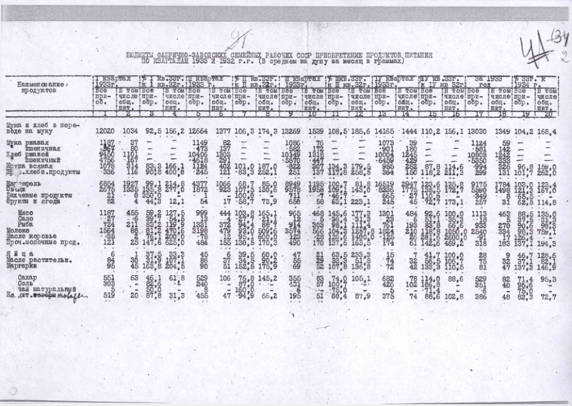 - Бюджеты фабрично-заводских семейных рабочих СССР. Приобретение продуктов питания по кварталам за 1932-1933 гг.