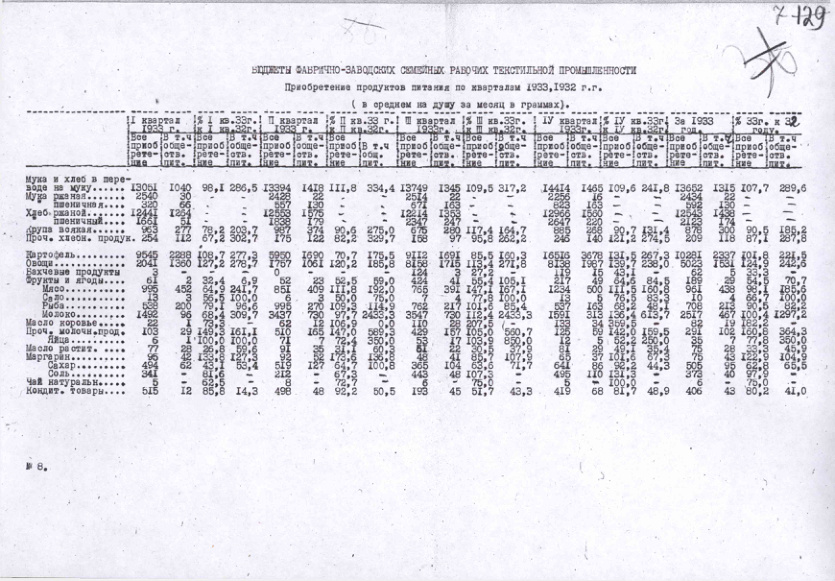 - Бюджеты фабрично-заводских семейных рабочих текстильной промышленности. Приобретение продуктов питания по кварталам за 1932-1933 гг.
