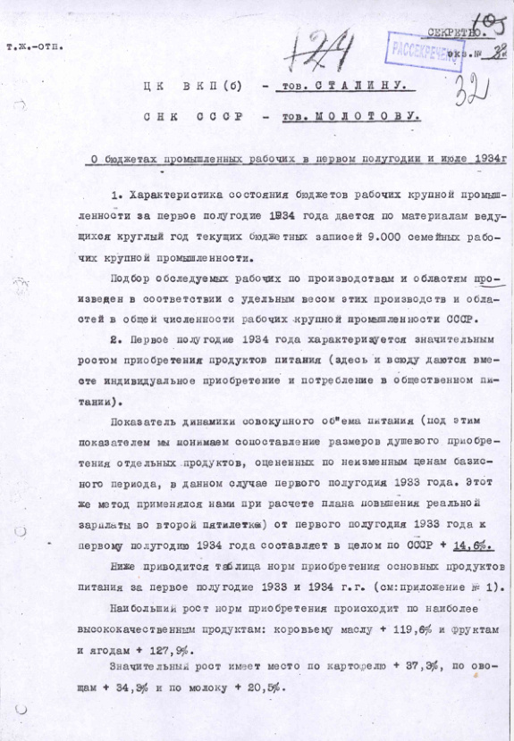 Справка ЦУНХУ о бюджетах промышленных рабочих в первом полугодии и июле 1934 г.
