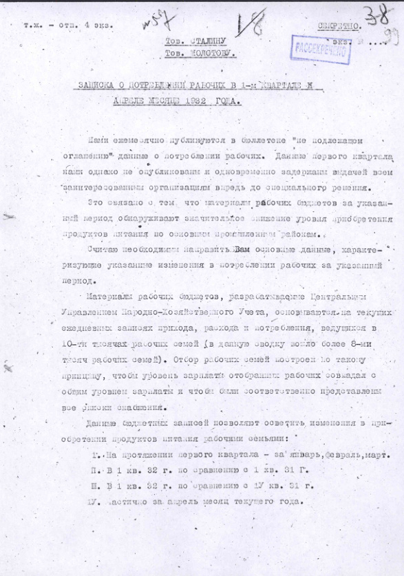 Записка ЦУНХУ о потреблении рабочих за январь-апрель 1932 г.