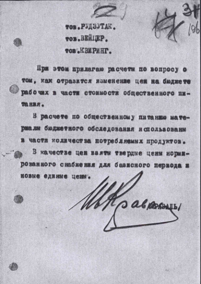 Расчеты ЦУНХУ о влиянии изменения цен на общественное питание на бюджете рабочих. 7 сентября 1935 г.