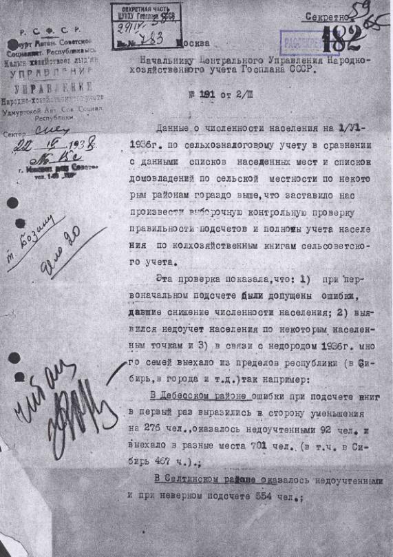 Записка УНХУ Удмуртской АССР о результатах выборочной проверки полноты учета населения по книгам сельсоветского учета. 22 апреля 1938 г.
