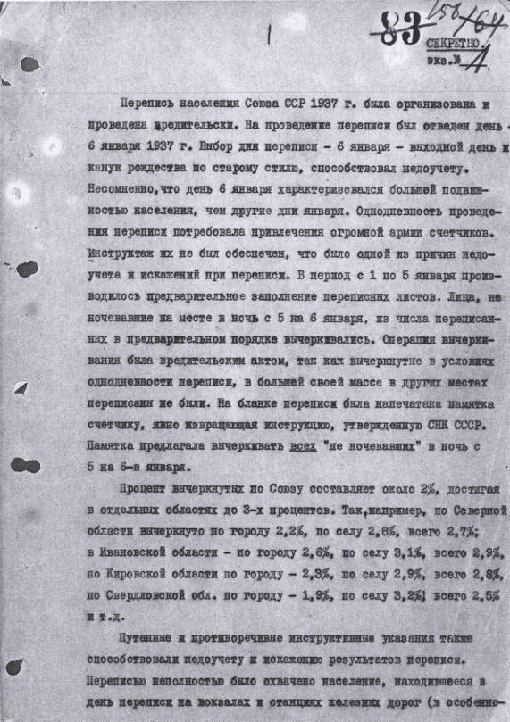 Проект предложений ЦУНХУ и обоснование внесения 4%-ой поправки к результатам переписи населения 1937 года. 19 августа 1937 г.