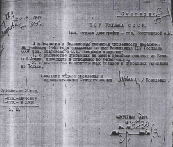 - Справка о прибывших в УССР демобилизованных, инвалидов и по репатриации. О количестве эвакуированных поляков и прибывших украинцев. 24 апреля 1946 г.