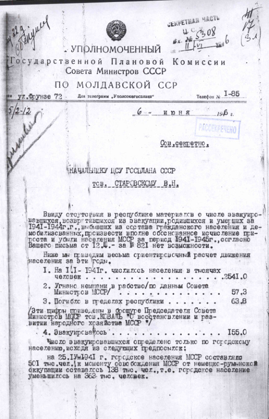 Расчет движения населения за период 1941-1945 гг. по Молдавской ССР. 6 июня 1946 г.
