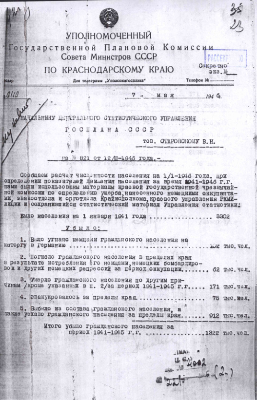 Расчет движения населения за период 1941-1945 гг. по Краснодарскому Краю. 7 мая 1946 г.