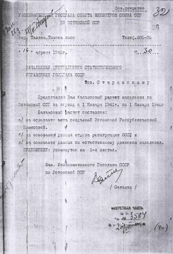 Расчет движения населения за период 1941-1945 гг. по Эстонской ССР. 16 апреля 1946 г.