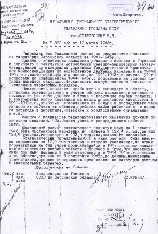 Расчет движения населения за период 1941-1945 гг. по Херсонской области. 9 апреля 1946 г.