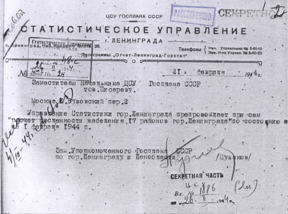 Расчет численности населения гор. Ленинграда на 1 февраля 1944 г.