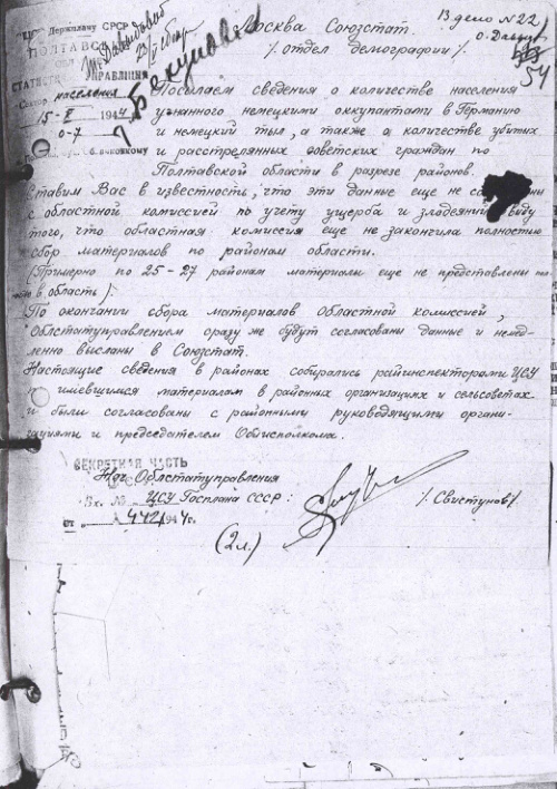 - Сведения о количестве населения угнанного в Германию, количестве убитых и расстрелянных советских граждан по Полтавской области. 15 мая 1944 г.