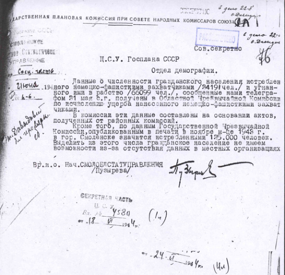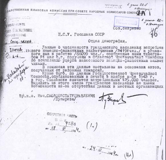Сведения о количестве населения угнанного в Германию, количестве убитых и расстрелянных советских граждан по Смоленской области. 18 июня 1944 г.